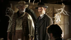 In the moments after William Bullock's accident, Hostetler and Samuel Fields begin to realize the enormity of their situation, as Seth Bullock carries the limp body of his stepson to Doc Cochran's. "Only violence we meant was to that stallion's prick," Hostetler says. "And that to turn an honest dollar." It soon becomes clear that all in town know the horse was the General's, and Hostetler is beside himself. Saying he won't beg for mercy, he makes a move to his rifle, but the General grabs it first. As they grapple over it, the smaller man pleads for the opportunity to get out of town. "Let's ride for six hours," he says, "...If you're still of a mind, I'll shoot you."